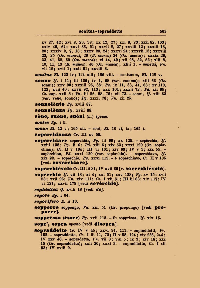 sonus El. 12 v; 165 xii. - soni, El. 10 vi, ix; 165 i. soperchianza Cv. Ili xv 59.