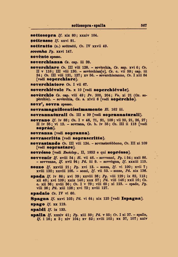 sovramagnificentissimamente El. 162 iii. sovrannaturali Cv. III x 39 [vedi soprannaturali], sovrano If. iv 88; Cv. I v 46, 71, 91, 109; vii 20, 21, 26, 27; II iv 35 ; vi 12. - sovrana, Cz. b. iv 35 ; Cv. III ii 118 [vedi sopràn]. sovranza [vedi sopranza]. sovrascritta [vedi soprascritto].