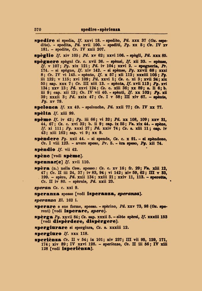 sperare e sue forme, spesso. - spèrino, Pd. xxv 73, 98 (Ox. spe-