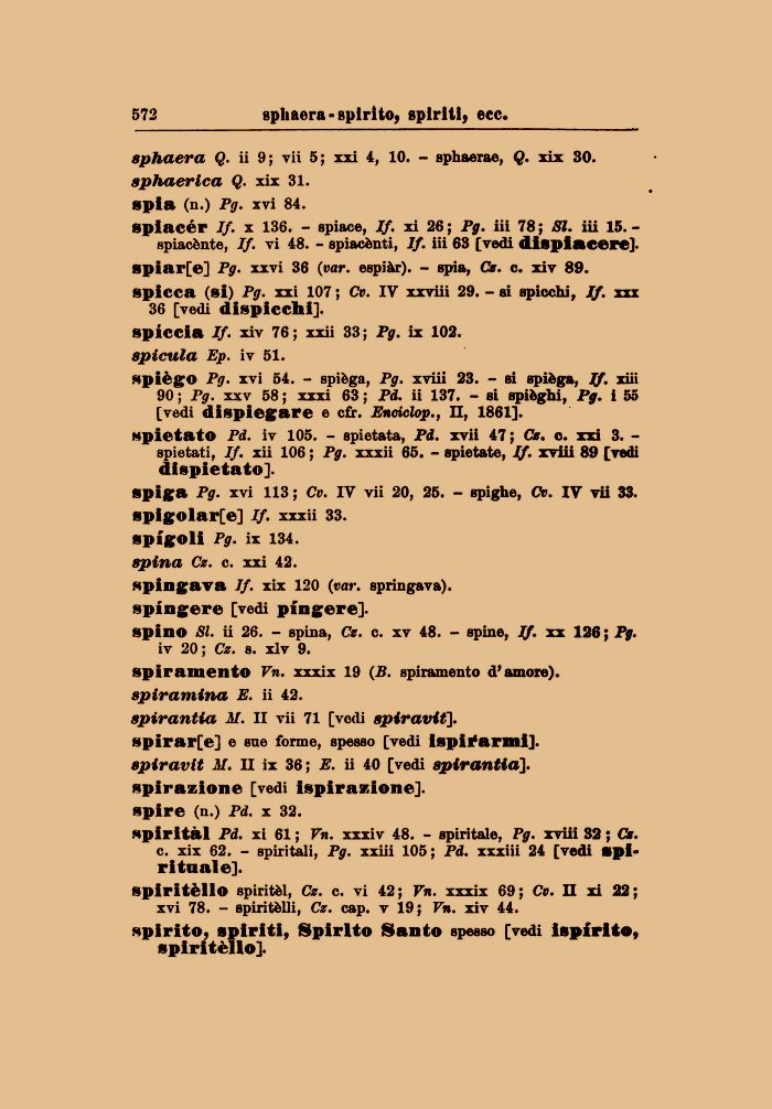spiritai Pd. xi 61 ; Vn. xxxiv 48. - spiritale, Pg. xviii 32 ; Cr. c. xix 62. - spiritali, Pg. xxiii 105 ; Pd. xxxiii 24 [vedi spirituale].