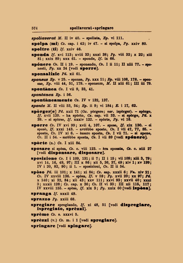 spoliaverat Al. II iv 40. - spoliata, Ep. vi 111. spolpa (mi) Cz. cap. i 42; iv 47. - si Bpolpa, Pg. xxiv 80. spoltre (ti) lf. xxiv 46.