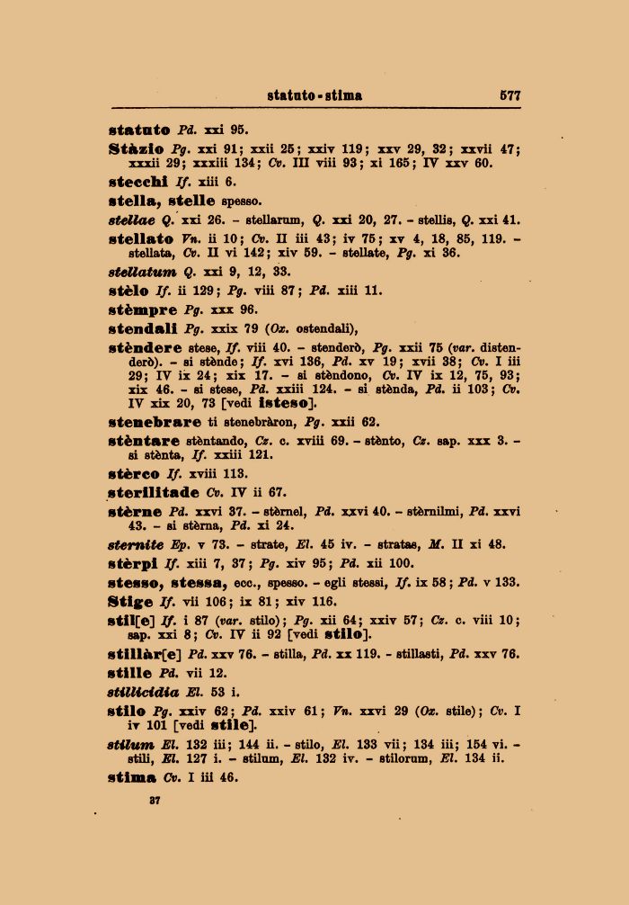 43. - si stèrna, Pd. xi 24. sterilite Ep. v 73. - strate, El. 45 iv. - stratas, M. II xi 48. stèrpi If. xiii 7, 37; Pg. xiv 95; Pd. xii 100. stesso, stessa, ecc., spesso. - egli stessi, If. ix 58 ; Pd. v 133. Stige If. vii 106 ; ix 81 ; xiv 116.