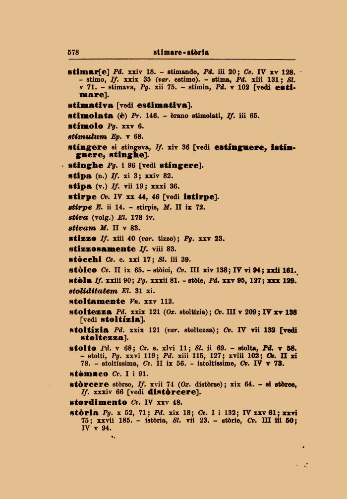 stòico Cv. II ix 65. - stòici, Cv. HI xiv 138; IV vi 94; xxii 161. Stòla If. xxiii 90; Pg. xxxii 81. - stòle, Pd. xxv 95, 127; xxx 129. stoliditatem El. 31 xi. stoltamente Vn. xxv 113.