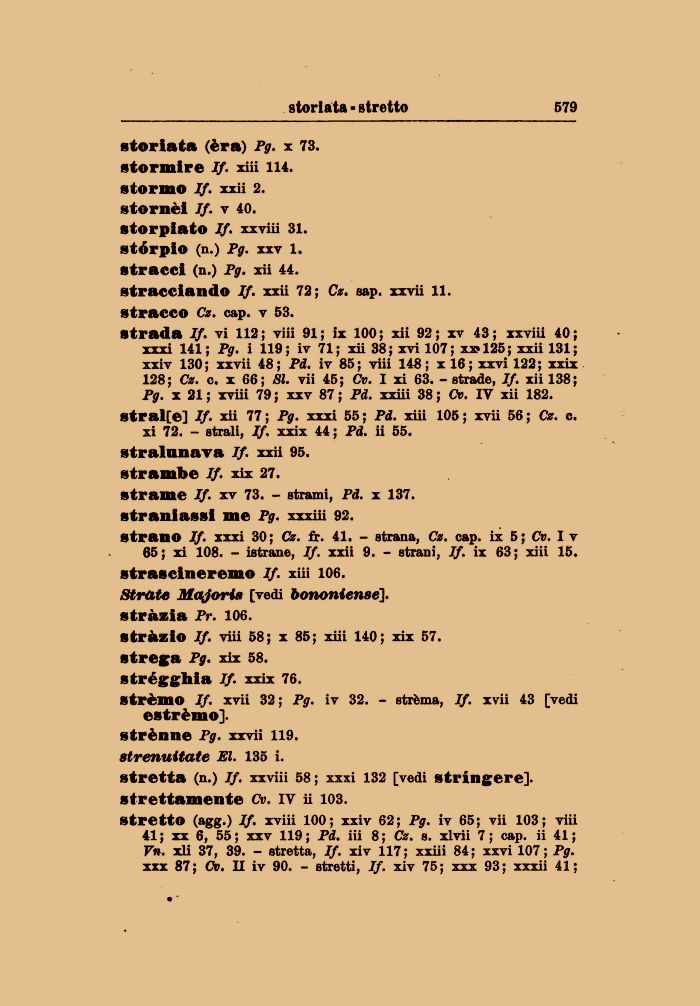Stretto (agg.) If. xviii 100; xxiv 62; Pg. iv 65; vii 103 ; viii 41 ; xx 6, 55 ; xxv 119 ; Pd. iii 8 ; Cz. s. xlvii 7 ; cap. ii 41 ; Fn. xii 37, 39. - stretta, If. xiv 117 ; xxiii 84 ; xxvi 107 ; Pg. xxx 87; Cv, II iv 90. - stretti, If. xiv 75; xxx 93; xxxii 41;