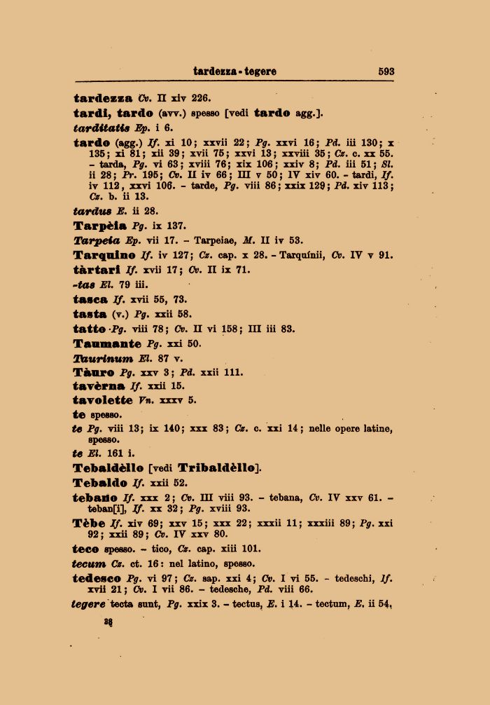tardo (agg.) If. xi 10; xxvii 22; Pg. xxvi 16; Pd. iii 130; x 135; xi 81; xii 39; xvii 75; xxvi 13; xxviii 35; Cz. c. xx 55. - tarda, Pg. vi 63 ; xviii 76 ; xix 106 ; xxiv 8 ; Pd. iii 51 ; SI. ii 28; Pr. 195; Cv. II iv 66 ; ni v 50 ; IV xiv 60. - tardi, If. iv 112, xxvi 106. - tarde, Pg. viii 86 ; xxix 129 ; Pd. xiv 113 ; Cz. b. ii 13. tardus E. ii 28. Tarpèia Pg. ix 137.