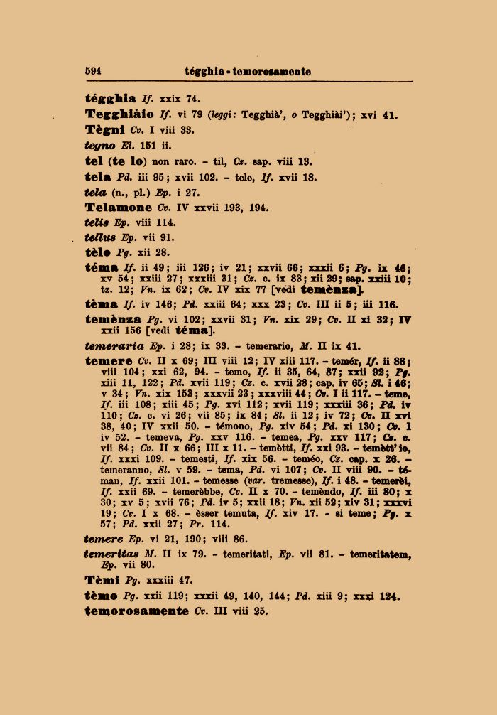 temere Cv. II x 69; III viii 12; IV xiii 117. - temér, lf. ii 88; viii 104; xxi 62, 94. - temo, If. ii 35, 64, 87; xxii 92; Pg. xiii 11, 122 ; Pd. xvii 119; Cz. e. xvii 28; cap. iv 65; 81. i 46; v 34 ; Vn. xix 153 ; xxxvii 23 ; xxxviii 44 ; Cv. I ii 117. — teme, If. iii 108; xiii 45; Pg. xvi 112; xvii 119; xxxiii 36; Pd. iv 110; Cz. c. vi 26; vii 85; ix 84; SI. ii 12 ; iv 72 ; Cv. n xvi 38, 40 ; IV xxii 50. - témono, Pg. xiv 54 ; Pd. xi 130 ; Cv. 1 iv 52. - temeva, Pg. xxv 116. - temea, Pg. xxv 117; Or. o. vii 84 ; Cv. II x 66; III x 11. - temètti, If. xxi 93. - temètt'io, If. xxxi 109. - temesti, If. xix 56. - teméo, Cz. cap. x 26. -torneranno, SI. v 59. - tema, Pd. vi 107; Cv. II viii 90. - té-man, If. xxii 101. - temesse (var. tremesse), If. i 48. - temerèi, If. xxii 69. - temerèbbe, Cv. Et x 70. - temèndo, If. iii 80; x 30 ; xv 5 ; xvii 76 ; Pd. iv 5 ; xxii 18 ; Vn. xii 52 ; xiv 31 ; xxxvi 19 ; Cv. I x 68. - èsser temuta, If. xiv 17. - si teme ; Pg. x 57; Pd. xxii 27; Pr. 114.