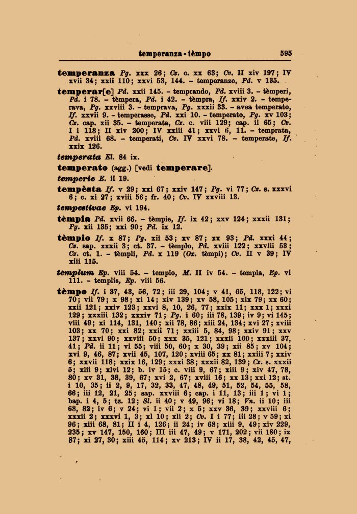 tèmpo If. i 37, 43, 56, 72; iii 29, 104; v 41, 65, 118, 122; vi 70; vii 79; x 98; xi 14; xiv 139; xv 58, 105; xix 79; xx 60 ; xxii 121; xxiv 123; xxvi 8, 10, 26, 77; xxix 11; xxx 1; xxxi 129 ; xxxiii 132 ; xxxiv 71 ; Pg. i 60 ; iii 78, 139 ; iv 9 ; vi 145 ; viii 49; xi 114, 131, 140; xii 78, 86; xiii 24, 134; xvi 27; xviii 103; xx 70; xxi 82; xxii 71; xxiii 5, 84, 98; xxiv 91; xxv 137 ; xxvi 90 ; xxviii 50 ; xxx 35, 121 ; xxxii 100 ; xxxiii 37, 41; Pd. ii 11; vi 55; viii 50, 60; x 30, 39; xii 85; xv 104; xvi 9, 46, 87; xvii 45, 107, 120; xviii 65; xx 81; xxiii 7; xxiv 6; xxvii 118; xxix 16, 129; xxxi 38; xxxii 82, 139; Cz. s. xxxii 5; xiii 9; xlvi 12; b. iv 15; e. viii 9, 67; xiii 9; xiv 47, 78, 80; xv 31, 38, 39, 67; xvi 2, 67; xviii 16; xx 13; xxi 12; st. i 10, 35; ii 2, 9, 17, 32, 33, 47, 48, 49, 51, 52, 54, 55, 58, 66 ; iii 12, 21, 25 ; sap. xxviii 6 ; cap. i 11, 13 ; iii 1 ; vi 1 ; bap. i 4, 5; tz. 12; SI. ii 40 ; v 49, 96; vi 18; Fn. ii 10; iii 68, 82; iv 6; v 24; vi 1 ; vii 2 ; x 5; xxv 36, 39; xxviii 6; xxxii 2; xxxvi 1, 3; xl 10 ; xii 2; Cv. I i 77; iii 28; v59; xi 96; xiii 68, 81; II i 4, 126; ii 24; iv 68; xiii 9, 49; xiv 229, 235 ; xv 147, 150, 160 ; HI iii 47, 49 ; v 171, 202 ; vii 180 ; ix 87; xi 27, 30; xiii 45, 114; xv 213; IV ii 17, 38, 42, 45, 47,