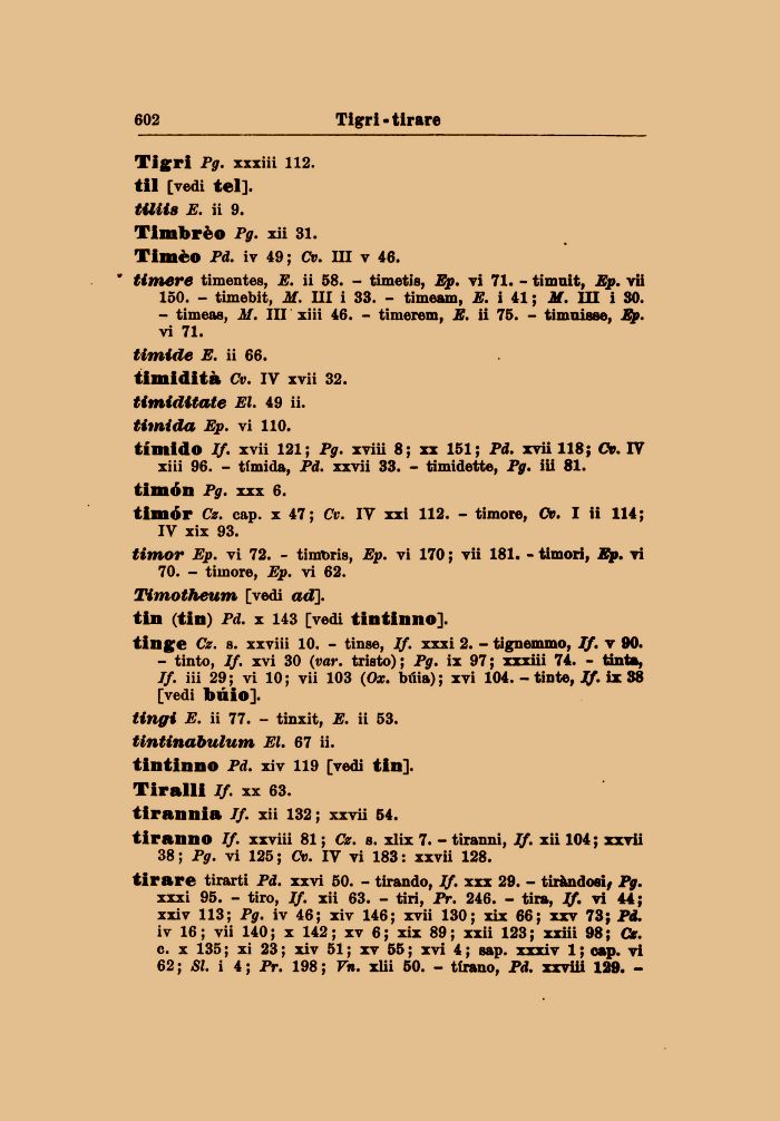 tingi E. ii 77. - tinxit, E. ii 53. tintinabulum El. 67 ii. tintinno Pd. xiv 119 [vedi tin]. Tirali! If. xx 63. tirannia If. xii 132; xxvii 54.