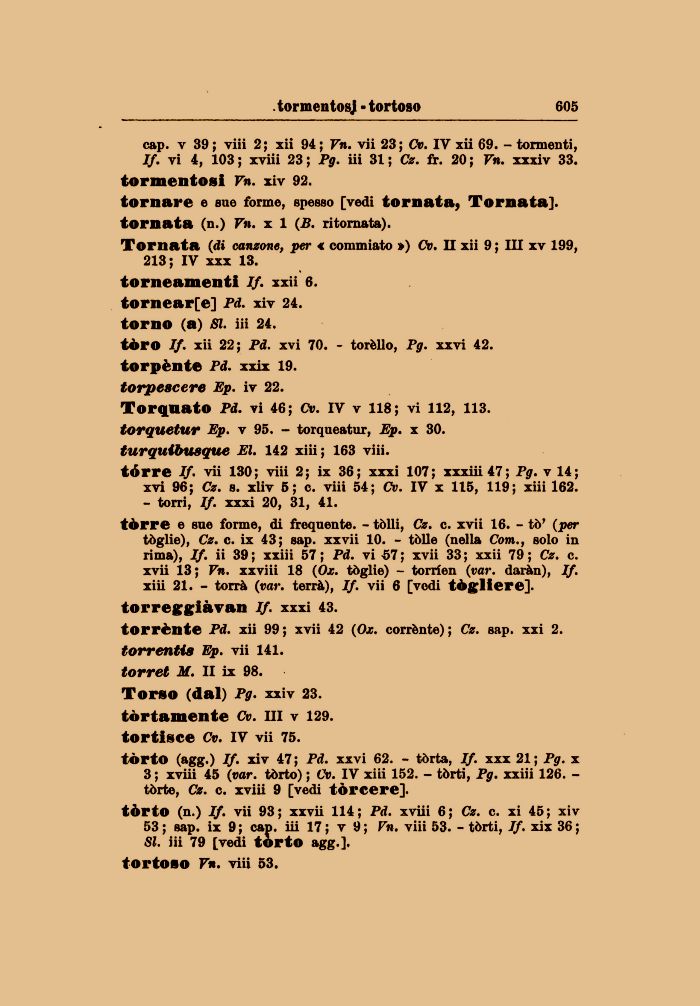 tòro If. xii 22; Pd. xvi 70. - torèllo, Pg. xxvi 42. torpènte Pd. xxix 19. torpescere Ep. iv 22.