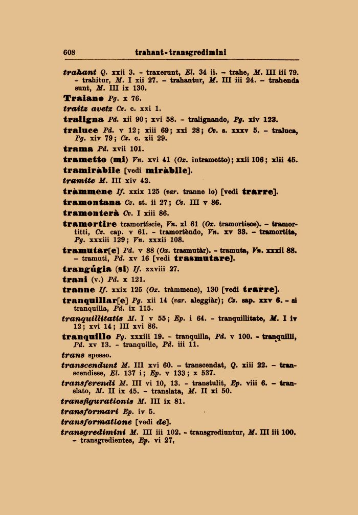 scendisse, El. 137 i; Ep. v 133 ; x 537. transferendi M. Ili vi 10, 13. - transtulit, Ep. viii 6. - translato, M. II ix 45. - translata, M. II xi 50. transfìgurationis M. Ili ix 81. transforinari Ep. iv 5. transformatlone [vedi de~\.