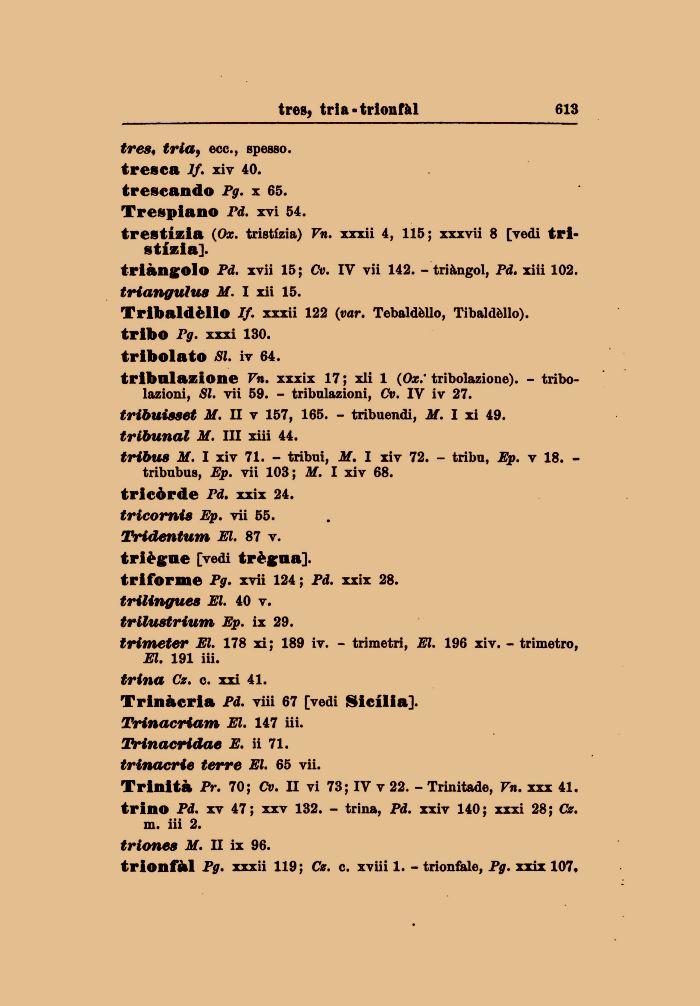 Trinàcria Pd. viii 67 [vedi Sicilia]. Trinacriam El. 147 iii. Trinacridae E. ii 71. trinaerie terre El. 65 vii.
