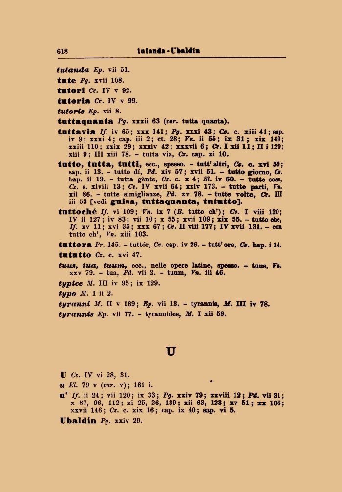 tutto, tutta, tutti, ecc., spesso. - tutt'altri, Cz. c. xvi 59; sap. ii 13. - tutto df, Pd. xiv 57 ; xvii 51. - tutto giorno, Cz. bap. ii 19. - tutta gènte, Cz. c. x 4; SI. iv 60. - tutte cose, Cz. s. xlviii 13 ; Cr. IV xvii 64 ; xxiv 173. — tutte parti, T». xii 86. - tutte simiglianze, Pd. xv 78. - tutte volte, Cr. IH iii 53 [vedi guisa, tnttaquanta, tututto]. tuttoché If. vi 109; Vn. ix 7 (B. tutto eh'); Cv. I viii 120; IV ii 127; iv 83; vii 10; x 55; xvii 109; xix 55. - tuttoché, If. xv 11; xvi 35; xxx 67; Cr. II vili 177; IV xvii 131. - con tutto eh', Vn. xiii 103.
