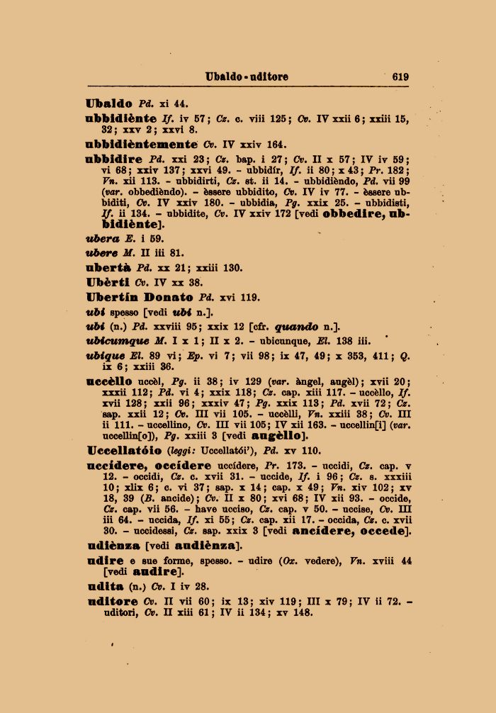 ubbidire Pd. xxi 23 ; Cz. bap. i 27 ; Cv. II x 57 ; IV iv 59 ; vi 68 ; xxiv 137 ; xxvi 49. - ubbidir, If. ii 80 ; x 43 ; Pr. 182 ; Vn. xii 113. - ubbidirti, Cz. st. ii 14. - ubbidièndo, Pd. vii 99 (var. obbedièndo). - èssere ubbidito, Cv. IV iv 77. - èssere ubbiditi, Cv. IV xxiv 180. - ubbidia, Pg. xxix 25. - ubbidisti, If. ii 134. - ubbidite, Cv. IV xxiv 172 [vedi obbedire, ubbidiènte]. ubera E. i 59. ubere M. II iii 81. ubertà Pd. xx 21; xxiii 130. libèrti Cv. IV xx 38. Ubertin Donato Pd. xvi 119. ubi spesso [vedi ubi u.].