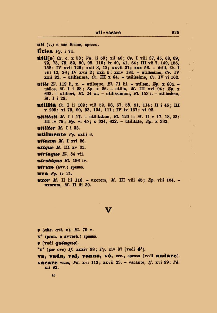 'v' (per ove) If. xxxiv 98; Pg. xiv 87 [vedi ó'J. va, vada, vai, vanno, vò, ecc., spesso [vedi andare], vacare vaca, Pd. xvi 113 ; xxvii 23. - vacante, If. xvi 99 ; Pd. xii 92.