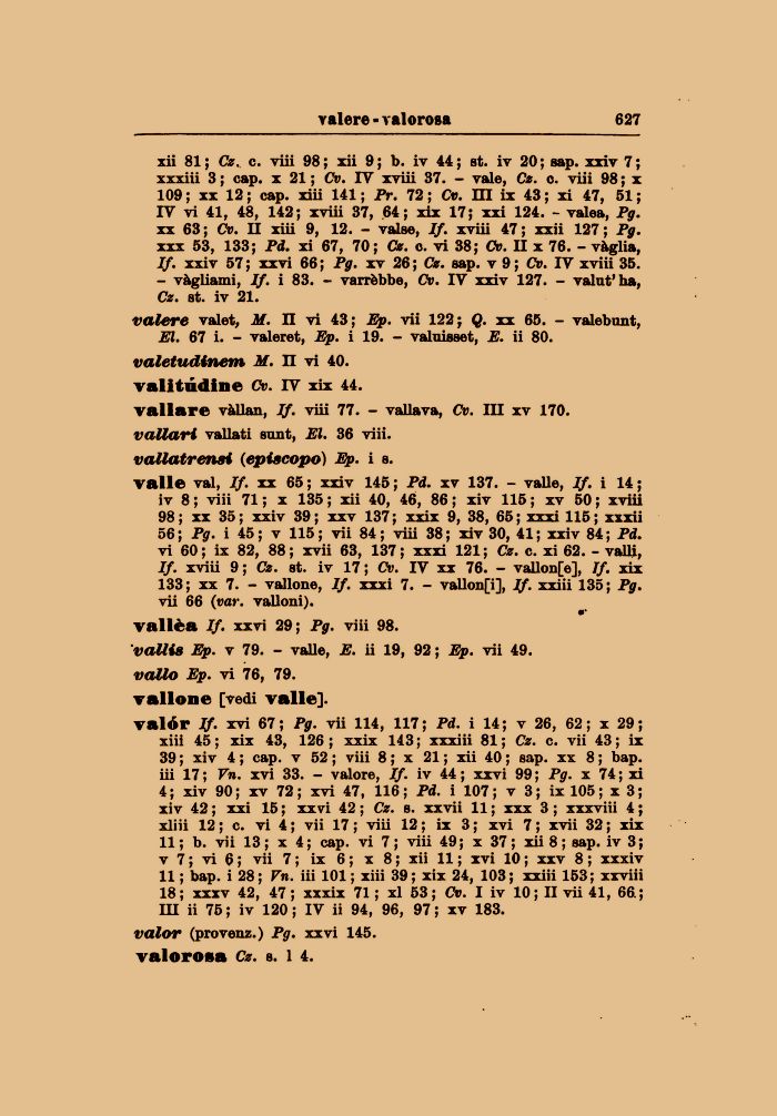 xii 81 ; Cz. c. viii 98 ; xii 9 ; b. iv 44 ; st. iv 20 ; sap. xxiv 7 ; xxxiii 3 ; cap. x 21 ; Cv. IV xviii 37. - vale, Cz. o. viii 98 ; x 109 ; xx 12 ; cap. xiii 141 ; Pr. 72 ; Cv. DI ix 43 ; xi 47, 51 ; IV vi 41, 48, 142; xviii 37, 64; xix 17; xxi 124. - valea, Pg. xx 63; Cv. II xiii 9, 12. - valse, If. xviii 47; xxii 127; Pg. xxx 53, 133; Pd. xi 67, 70; Cz. o. vi 38; Co. II x 76. - vŕglia, If. xxiv 57; xxvi 66; Pg. xv 26; Cz. sap. v 9; Cv. IV xviii 35. - vŕgliami, If. i 83. - varrčbbe, Co. IV xxiv 127. - valut'ha, Cz. st. iv 21.