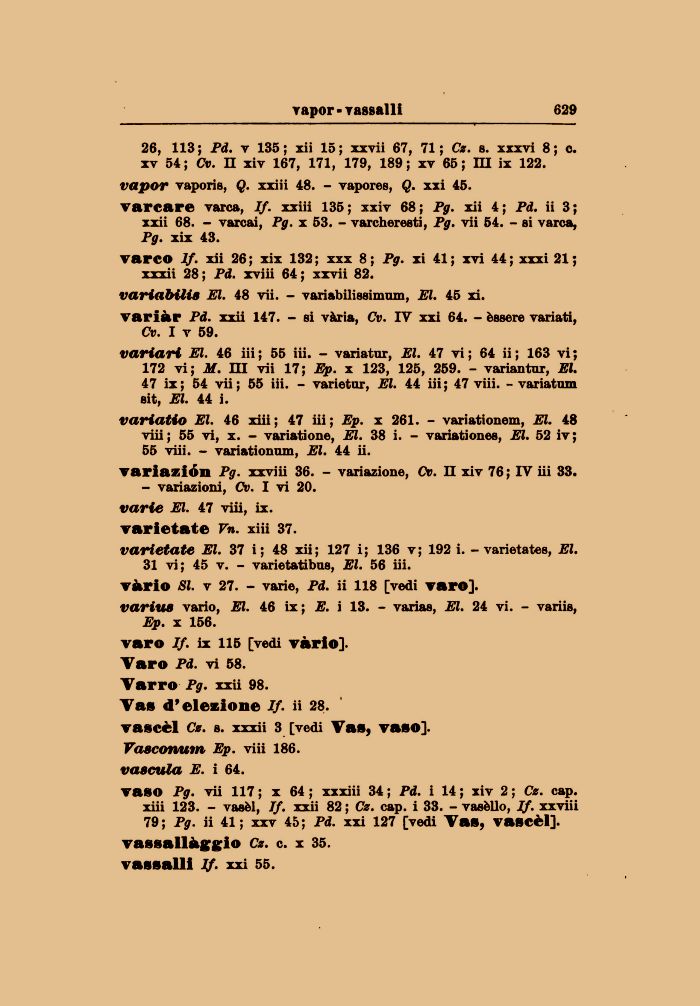 variavi El. 46 iii; 55 iii. - variatur, El. 47 vi; 64 ii ; 163 vi; 172 vi ; M. HI vii 17; Ep. x 123, 125, 259. - variantur, El. 47 ix ; 54 vii ; 55 iii. - varietor, El. 44 iii ; 47 viii. - variatimi sit, El. 44 i.