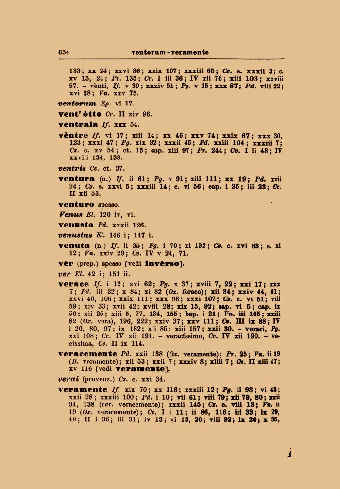 xxii 28; xxxiii 100; Pd. i 10; vii 61; viii 79 ; xii 79, 80; xxii 94, 138 (var. veracemente); xxxii 145; Cr. e. viii 13; Vn. ii 19 (Ox. veracemente); Cv. I i 11 ; ii 86, 116; iii 33; ix 29, 48; II i 36; iii 31; iv 13; vi 13, 20; viii 82; ix 20; x 35,