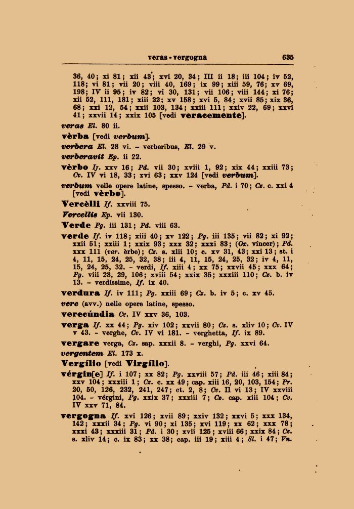 v 43. - verghe, Cv. IV vi 181. - verghétta, If. ix 89. vergare verga, Cz. sap. xxxii 8. - verghi, Pg. xxvi 64. vergentem El. 173 x. Vergilio [vedi Virgilio].