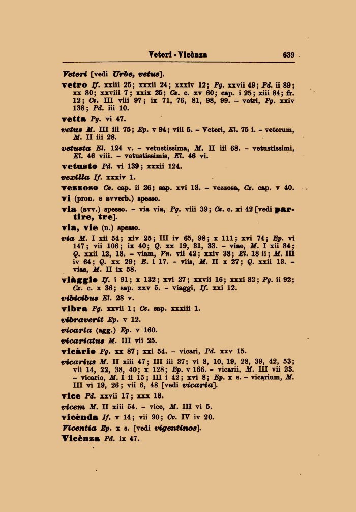 via M. I xii 54; xiv 25 ; UI iv 65, 98; x 111; xvi 74; Ep. vi 147; vii 106; ix 40; Q. xx 19, 31, 33. - viae, M. I xii 84; Q. xxii 12, 18. - viam, Vn. vii 42 ; xxiv 38 ; El. 18 ii ; M. Ili iv 64; Q. xx 29; E. i 17. - viis, M. II x 27; Q. xxii 13. -vias, M. II ix 58. viàggio If. i 91; x 132; xvi 27; xxvii 16; xxxi 82; Pg. ii 92; Cz. c. x 36; sap. xxv 5. - viaggi, If. xxi 12.