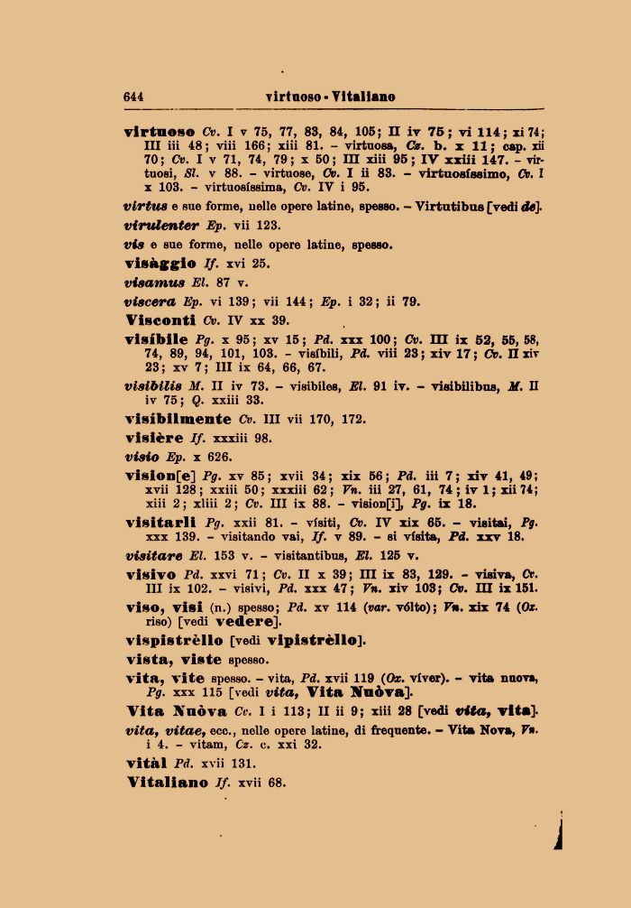 vision[e] Pg. xv 85; xvii 34; xix 56; Pd. iii 7; xiv 41, 49; xvii 128; xxiii 50; xxxiii 62; Vn. iii 27, 61, 74 ; iv 1 ; xii 74; xiii 2; xliii 2; Cv. Ili ix 88. - visionfi], Pg. ix 18.