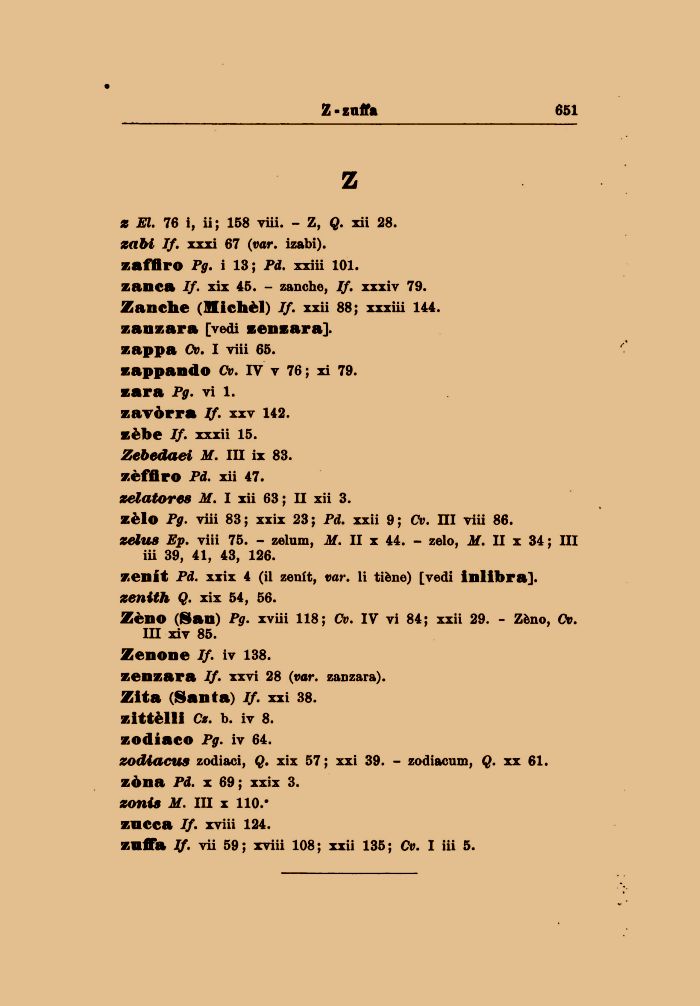 zodiacu» zodiaci, Q. xix 57 ; xxi 39. - zodiacum, Q. xx 61. zòna Pd. x 69 ; xxix 3. toni» M. IH x 110.-zncca If. xviii 124.