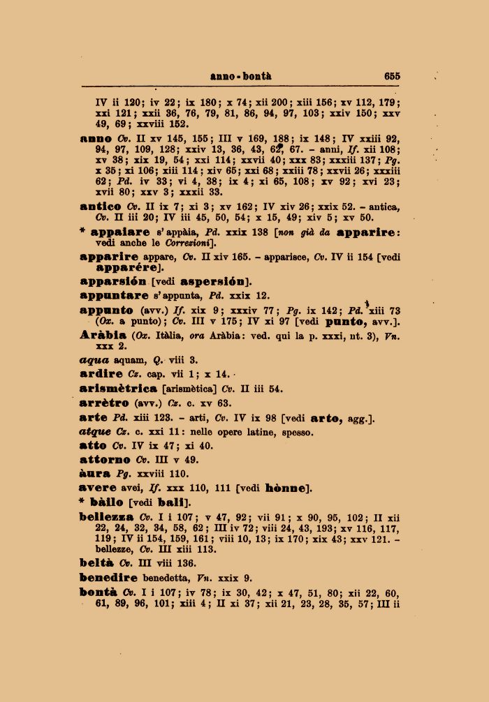 anno Cv. II xv 145, 155 ; III v 169, 188 ; ix 148 ; IV xxiii 92, 94, 97, 109, 128 ; xxiv 13, 36, 43, 6f, 67. - anni, If. xii 108 ; xv 38; xix 19, 54; xxi 114 ; xxvii 40; xxx 83; xxxiii 137; Pg. x 35 ; xi 106; xiii 114 ; xiv 65; xxi 68 ; xxiii 78 ; xxvii 26; xxxiii 62 ; Pd. iv 33; vi 4, 38; ix 4; xi 65, 108; xv 92; xvi 23; xvii 80 ; xxv 3 ; xxxii 33.