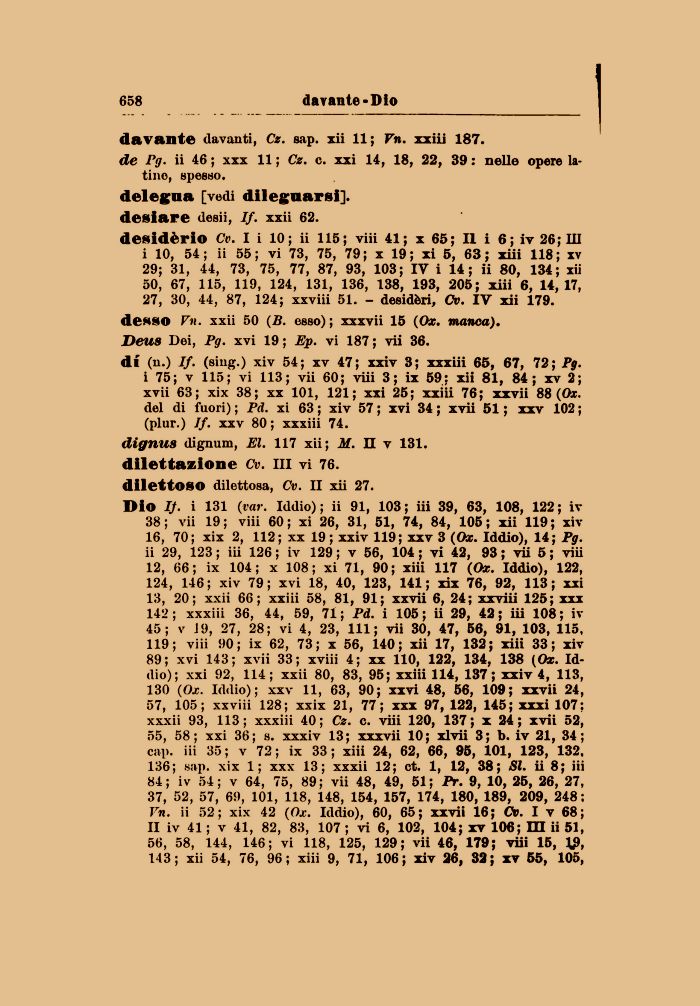 desidèrio Cv. 1 i 10; ii 115; viii 41 ; x 65; Il i 6 ; iv 26; III i 10, 54; ii 55; vi 73, 75, 79; x 19; xi 5, 63; xiii 118; xv 29; 31, 44, 73, 75, 77, 87, 93, 103; IV i 14 ; ii 80, 134; xii 50, 67, 115, 119, 124, 131, 136, 138, 193, 205; xiii 6, 14,17, 27, 30, 44, 87, 124; xxviii 51. - desidèri, Cv. IV xii 179.