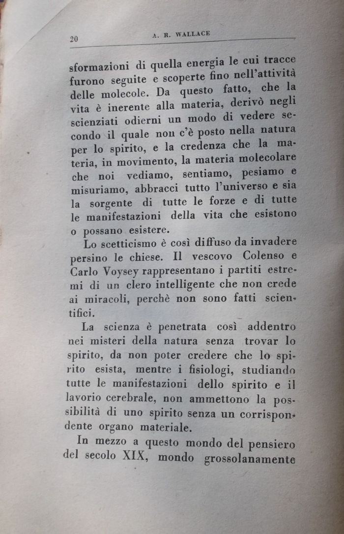 sformazioni di quella energia le cui tracce furono seguite e scoperte fino nell'attività delle molecole. Da questo fatto, che la vita è inerente alla materia, derivò negli scienziati odierni un modo di vedere secondo il quale non c'è posto nella natura per lo spirito, e la credenza che la materia, in movimento, la materia molecolare che noi vediamo, sentiamo, pesiamo e misuriamo, abbracci tutto l'universo e sia la sorgente di tutte le forze e di tutte le manifestazioni della vita che esistono o possano esistere.