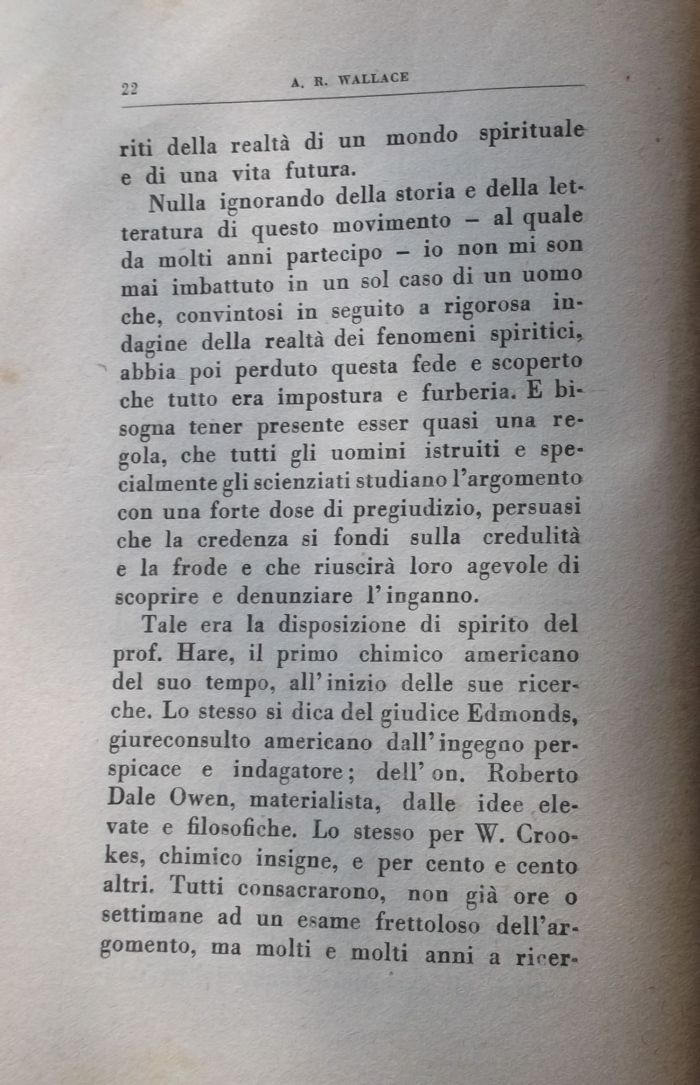Nulla ignorando della storia e della letteratura di questo movimento — al quale da molti anni partecipo - io non mi son mai imbattuto in un sol caso di un uomo che, convintosi in seguito a rigorosa indagine della realtà dei fenomeni spiritici» abbia poi perduto questa fede e scoperto che tutto era impostura e furberia. E bisogna tener presente esser quasi una regola, che tutti gli uomini istruiti e specialmente gli scienziati studiano l'argomento con una forte dose di pregiudizio, persuasi che la credenza si fondi sulla credulità e la frode e che riuscirà loro agevole di scoprire e denunziare l'inganno.