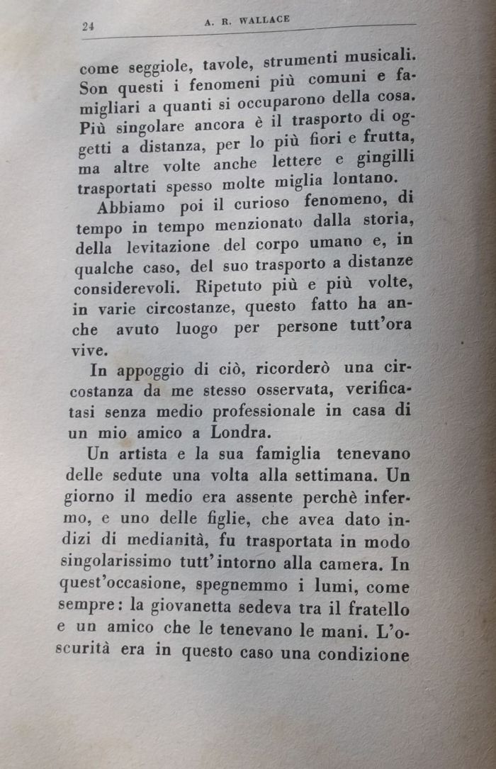 Abbiamo poi il curioso fenomeno, di tempo in tempo menzionato dalla storia, della levitazione del corpo umano e, in qualche caso, del suo trasporto a distanze considerevoli. Ripetuto più e più volte, in varie circostanze, questo fatto ha anche avuto luogo per persone tutt'ora vive.