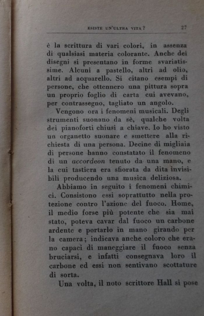 Vengono ora i fenomeni musicali. Degli strumenti suonano da sč, qualche volta dei pianoforti chiusi a chiave. Io ho visto un organetto suonare e smettere alla richiesta di una persona. Decine di migliaia di persone hanno constatato il fenomeno di un accordeon tenuto da una mano, e la cui tastiera era sfiorata da dita invisibili producendo una musica deliziosa.
