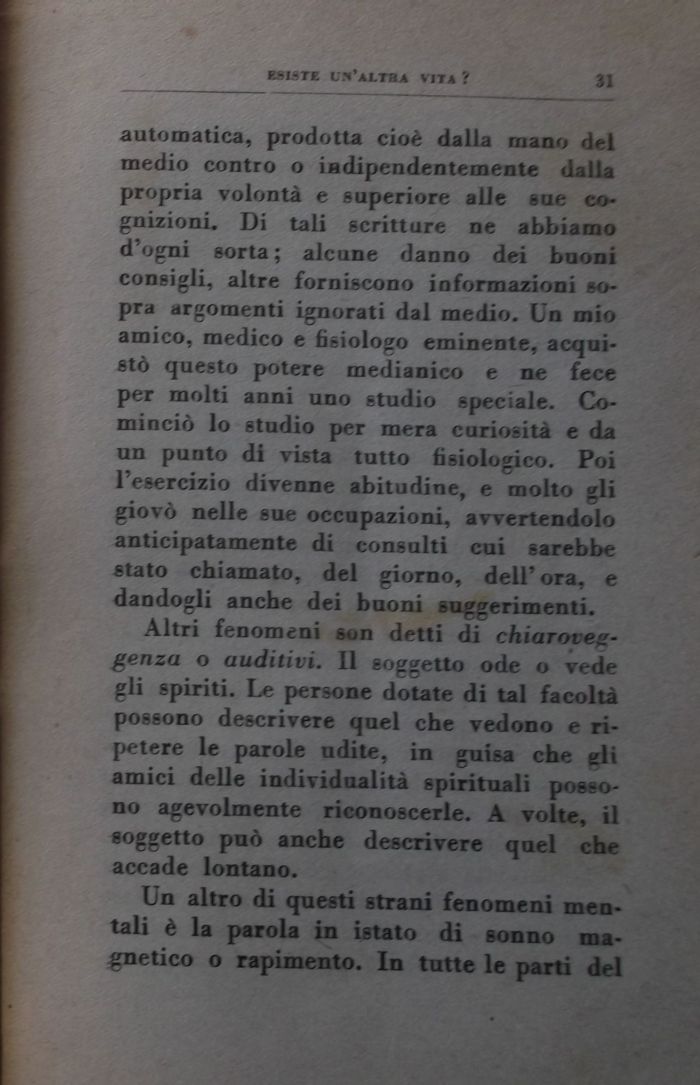 automatica, prodotta cioè dalla mano del medio contro o indipendentemente dalla propria volontà e superiore alle sue cognizioni. Di tali scritture ne abbiamo d'ogni sorta ; alcune danno dei buoni consigli, altre forniscono informazioni sopra argomenti ignorati dal medio. Un mio amico, medico e fisiologo eminente, acquistò questo potere medianico e ne fece per molti anni uno studio speciale. Cominciò lo studio per mera curiosità e da un punto di vista tutto fisiologico. Poi l'esercizio divenne abitudine, e molto gli giovò nelle sue occupazioni, avvertendolo anticipatamente di consulti cai sarebbe «tato chiamato, del giorno, dell' ora, e dandogli anche dei baoni suggerimenti.