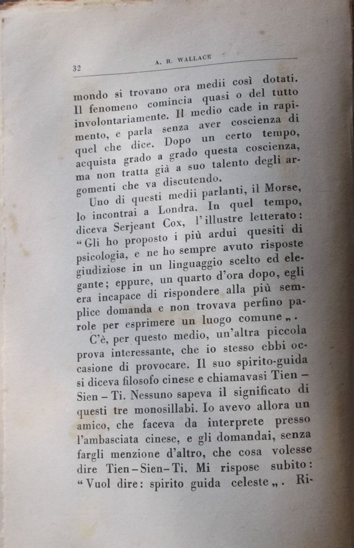 Uno di questi medii parlanti, il Morse, lo incontrai a Londra. In quel tempo, diceva Serjeant Cox, l'illustre letterato: ' Gli ho proposto i più ardui quesiti di psicologia, e ne ho sempre avuto risposte giudiziose in un linguaggio scelto ed elegante; eppure, un quarto d'ora dopo, egli era incapace di rispondere alla più semplice domanda e non trovava perfino parole per esprimere un luogo comune n .