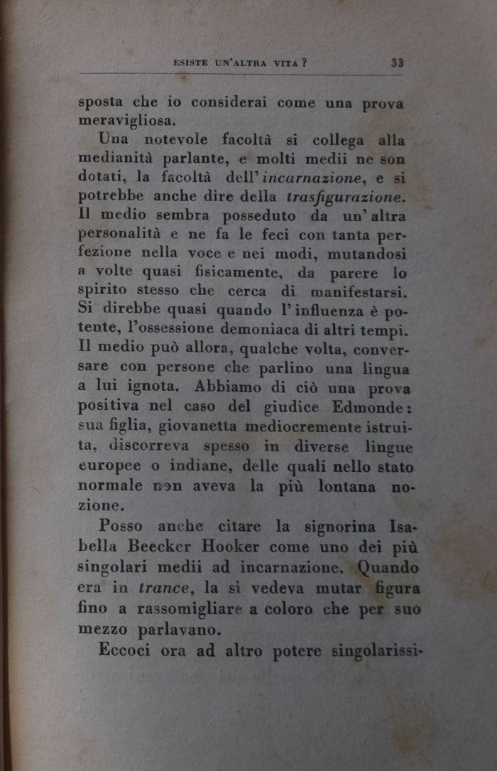 Una notevole facoltà si collega alla medianità parlante, e molti medii ne son dotati, la facoltà dell' incarnazione, e si potrebbe anche dire della trasfigurazione. Il medio sembra posseduto da un' altra personalità e ne fa le feci con tanta perfezione nella voce e nei modi, mutandosi a volte quasi fisicamente, da parere lo spirito stesso che cerca di manifestarsi. Si direbbe quasi quando l'influenza è potente, l'ossessione demoniaca di altri tempi. Il medio può allora, qualche volta, conversare con persone che parlino una lingua a lui ignota. Abbiamo di ciò una prova positiva nel caso del giudice Edmonde ; sua figlia, giovanetta mediocremente istruita, discorreva spesso in diverse lingue europee o indiane, delle quali nello stato normale non aveva la più lontana nozione.