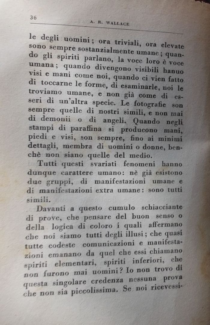 le degli uomini ; ora triviali, ora elevate sono sempre sostanzialmente umane ; quando gli spiriti parlano, la voce loro č voce umana ; quando divengono visibili hanuo visi e mani come noi, quando ci vien fatto di toccarne le forme, di esaminarle, noi le troviamo umane, e non giā come di esseri di un'altra specie. Le fotografėe son sempre quelle di nostri simili, e non mai di demonii o di angeli. Quando negli stampi di paraffina si producono mani, piedi e visi, son sempre, fino ai minimi dettagli, membra di uomini o donne, benché non siano quelle del medio.