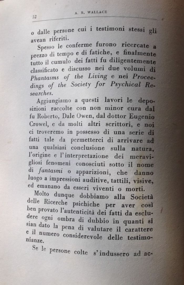 Aggiungiamo a questi lavori le depo* sizioni raccolte con non minor cura dal fu Roberto, Dale Owen, dal dottor Eugenio Crowel, e da molti altri scrittori, e noi ci troveremo in possesso di una serie di fatti tale da permetterci di arrivare ad una qualsiasi conclusione sulla natura, l'origine e l'interpretazione dei meravi^ gliosi fenomeni conosciuti sotto il nome di fantasmi o apparizioni, che danno luogo a impressioni auditive, tattili, visive, ed emanano da esseri viventi o morti.