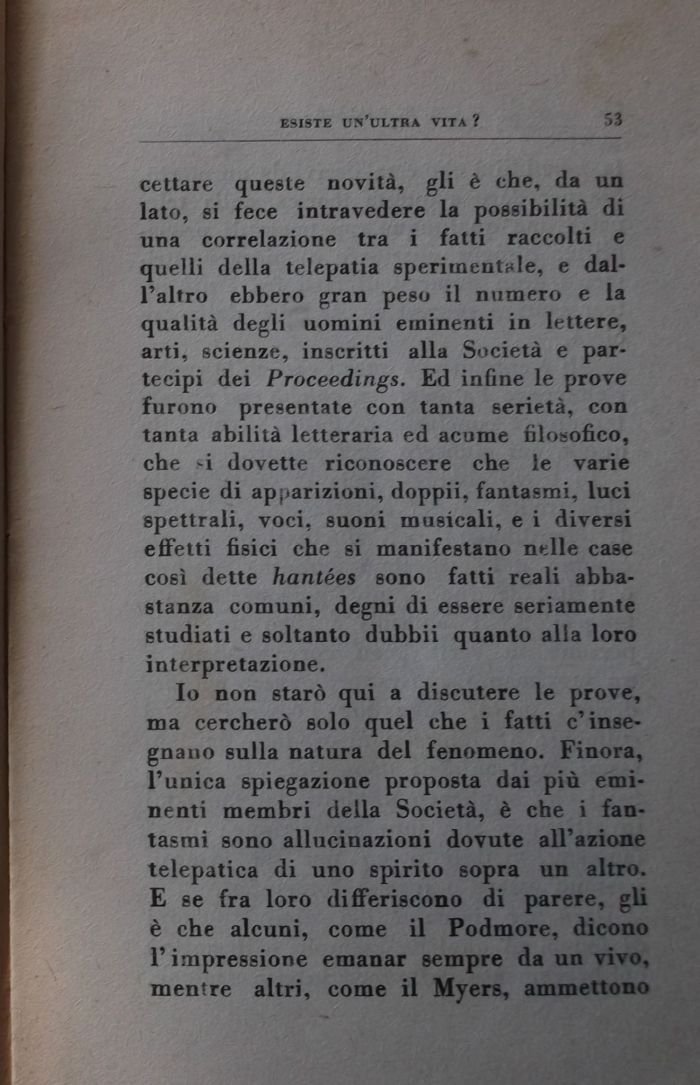Io non starò qui a discutere le prove, ma cercherò solo quel che i fatti c'insegnano sulla natura del fenomeno. Finora, l'unica spiegazione proposta dai più eminenti membri della Società, è che i fantasmi sono allucinazioni dovute all'azione telepatica di uno spirito sopra un altro. E se fra loro differiscono di parere, gli è che alcuni, come il Podmore, dicono l'impressione emanar sempre da un vivo, mentre altri, come il Myers, ammettono