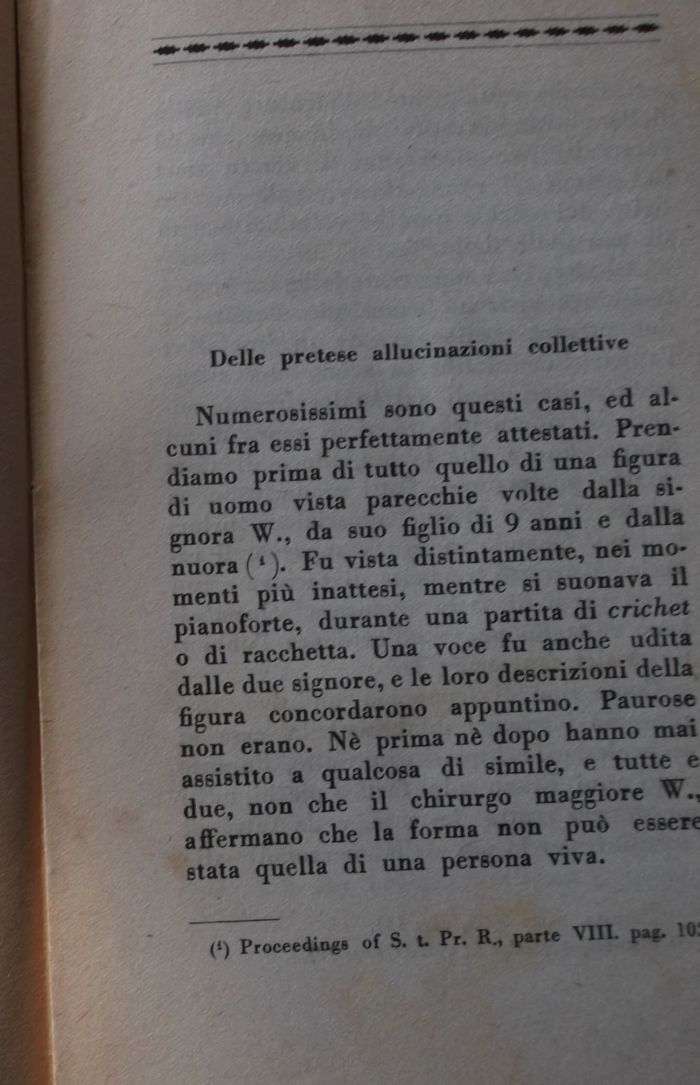 Numerosissimi sono questi casi, ed alcuni fra essi perfettamente attestati. Prendiamo prima di tutto quello di una figura di uomo vista parecchie volte dalla signora W., da suo figlio di 9 anni e dalla nuora (1 ). Fu vista distintamente, nei momenti più inattesi, mentre si suonava il pianoforte, durante una partita di cricket o di racchetta. Una voce fu anche udita dalle due signore, e le loro descrizioni della figura concordarono appuntino. Paurose non erano. Nè prima nè dopo hanno mai assistito a qualcosa di simile, e tutte e due, non che il chirurgo maggiore W., affermano che la forma non può essere stata quella di una persona viva.