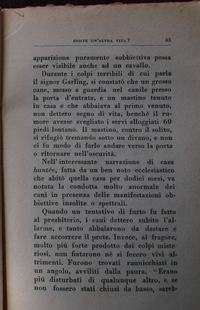 Neil' interessante narrazione di casa hantée, fatta da un ben noto ecclesiastico che abitò quella casa per dodici mesi, va notata la condotta molto anormale dei cani in presenza delle manifestazioni obbiettive insolite o spettrali.