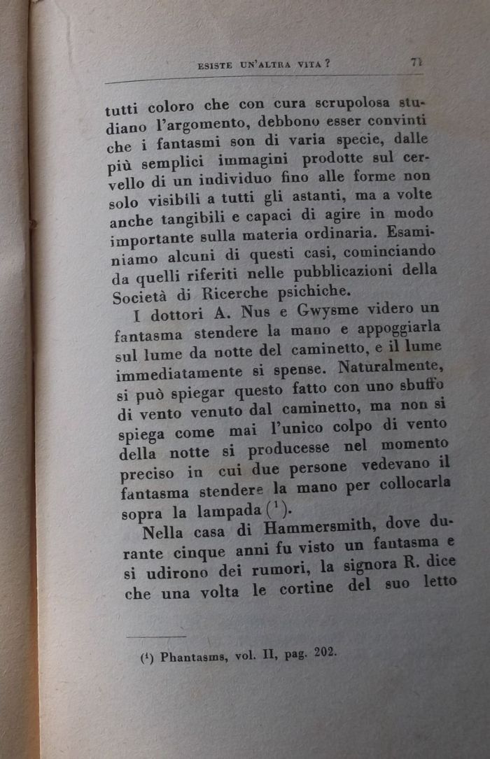 tutti coloro che con cura scrupolosa studiano l'argomento, debbono esser convinti che i fantasmi son di varia specie, dalle più semplici immagini prodotte sul cervello di un individuo fino alle forme non solo visibili a tutti gli astanti, ma a volte anche tangibili e capaci di agire in modo importante sulla materia ordinaria. Esaminiamo alcuni di questi casi, cominciando da quelli riferiti nelle pubblicazioni della Società di Ricerche psichiche.