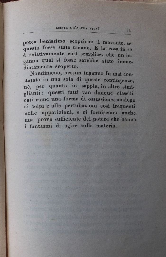 Nondimeno, nessun inganno fu mai constatato in una sola di queste contingenze, nč, per quanto io sappia, in altre simi-glianti: questi fatti van dunque classificati come una forma di ossessione, analoga ai colpi e alle pertubazioni cosė frequenti nelle apparizioni, e ci forniscono anche una prova sufficiente del potere che hanno i fantasmi di agire sulla materia.