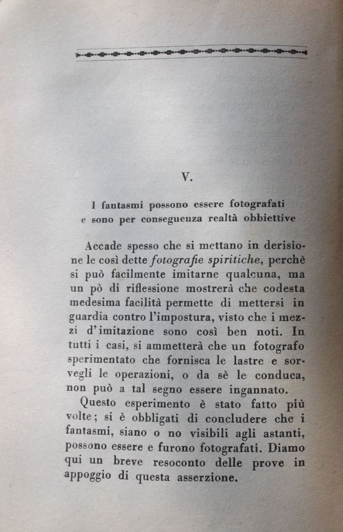 Questo esperimento è stato fatto più volte ; si è obbligati di concludere che i fantasmi, siano o no visibili agli astanti, possono essere e furono fotografati. Diamo qui un breve resoconto delle prove in appoggio di questa asserzione.
