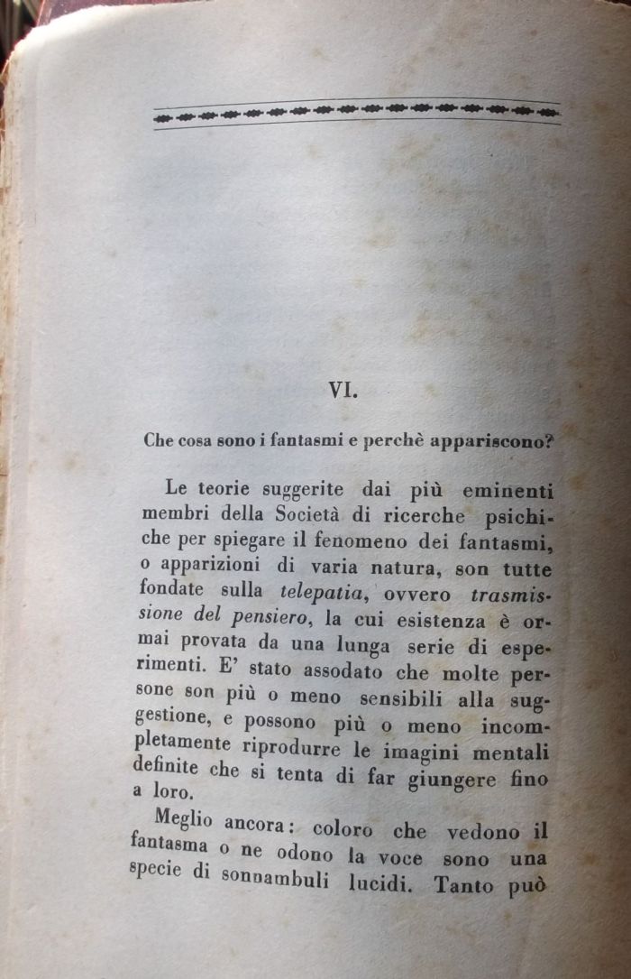 Le teorie suggerite dai più eminenti membri della Società di ricerche psichiche per spiegare il fenomeno dei fantasmi, o apparizioni di varia natura, son tutte fondate sulla telepatia, ovvero trasmis' sione del pensiero, la cui esistenza è ormai provata da una lunga serie di esperimenti. E' stato assodato che molte persone son più o meno sensibili alla suggestione, e possono più o meno incompletamente riprodurre le imagini mentali definite che si tenta di far giungere fino a loro.