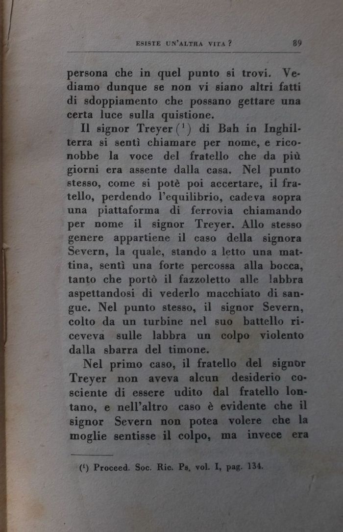 Il signor Treyer(1) di Bah in Inghilterra si sentì chiamare per nome, e riconobbe la voce del fratello che da più giorni era assente dalla casa. Nel punto stesso, come si potè poi accertare, il fratello, perdendo l'equilibrio, cadeva sopra una piattaforma di ferrovia chiamando per nome il signor Treyer. Allo stesso genere appartiene il caso della signora Severn, la quale, stando a letto una mattina, sentì una forte percossa alla bocca, tanto che portò il fazzoletto alle labbra aspettandosi di vederlo macchiato di sangue. Nel punto stesso, il signor Severn, colto da un turbine nel suo battello riceveva sulle labbra un colpo violento dalla sbarra del timone.