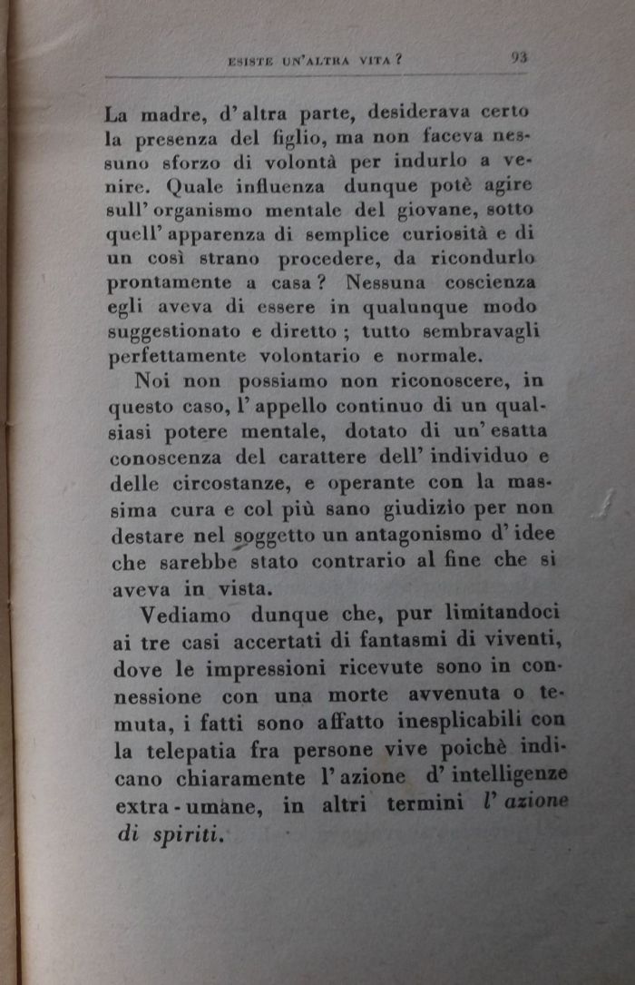 La madre, d'altra parte, desiderava certo la presenza del figlio, ma non faceva nessuno sforzo di volontà per indurlo a venire. Quale influenza dunque potè agire sull' organismo mentale del giovane, sotto quell' apparenza di semplice curiosità e di un così strano procedere, da ricondurlo prontamente a casa ? Nessuna coscienza egli aveva di essere in qualunque modo suggestionato e diretto ; tutto sembravagli perfettamente volontario e normale.