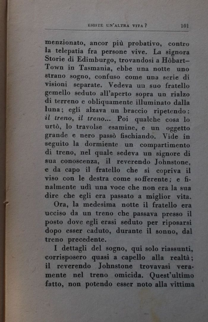 menzionato, ancor più probativo, contro la telepatia fra persone vive. La signora Storie di Edimburgo, trovandosi a Hòbart-Town in Tasmania, ebbe una notte uno strano sogno, confuso come una serie di visioni separate. Vedeva un suo fratello gemello seduto all'aperto sopra un rialzo di terreno e obliquamente illuminato dalla luna ; egli alzava un braccio ripetendo : il treno, U treno... Poi qualche cosa lo urtò, lo travolse esamine, e un oggetto grande e nero passò fischiando. Vide in seguito la dormiente un compartimento di treno, nel quale sedeva un signore di sua conoscenza, il reverendo Johnstone, e da capo il fratello che si copriva il viso con le destra come sofferente; e finalmente udì una voce che non era la sua dire che egli era passato a miglior vita.