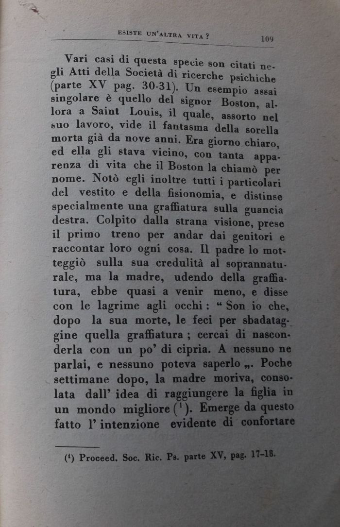 Vari casi di questa specie son citati negli Atti della Società di ricerche psichiche (parte XV pag. 30-31). Un esempio assai singolare è quello del signor Boston, allora a Saint Louis, il quale, assorto nel 6UO lavoro, vide il fantasma della sorella morta già da nove anni. Era giorno chiaro, ed ella gli stava vicino, con tanta apparenza di vita che il Boston la chiamò per nome. Notò egli inoltre tutti i particolari del vestito e della fisionomia, e distinse specialmente una graffiatura sulla guancia destra. Colpito dalla strana visione, prese il primo treno per andar dai genitori e raccontar loro ogni cosa. Il padre lo motteggiò sulla sua credulità al soprannaturale, ma la madre, udendo della graffiatura, ebbe quasi a venir meno, e disse con le lagrime agli occhi : M Son io che, dopo la sua morte, le feci per sbadataggine quella graffiatura ; cercai di nasconderla con un po' di cipria. A nessuno ne parlai, e nessuno poteva saperlo „. Poche settimane dopo, la madre moriva, consolata dall' idea di raggiungere la figlia in un mondo migliore (1 ). Emerge da questo fatto r intenzione evidente di confortare
