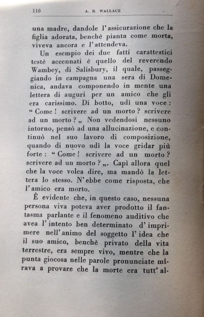 Un esempio dei due fatti carattestici testé accennati è quello del reverendo Wambey, di Salisbury, il quale, passeggiando in campagna una sera di Domenica, andava componendo in mente una lettera di auguri per un amico che gli era carissimo. Di botto, udì una voce : ' Come ! scrivere ad un morto ? scrivere ad un morto ? „ Non vedendosi nessuno intorno, pensò ad una allucinazione, e continuò nel suo lavoro di composizione, quando di nuovo udì la voce gridar più forte : u Come ! scrivere ad un morto ? scrivere ad un morto ? „. Capì allora quel che la voce volea dire, ma mandò la lettera lo stesso. N'ebbe come risposta, che l'amico era morto.