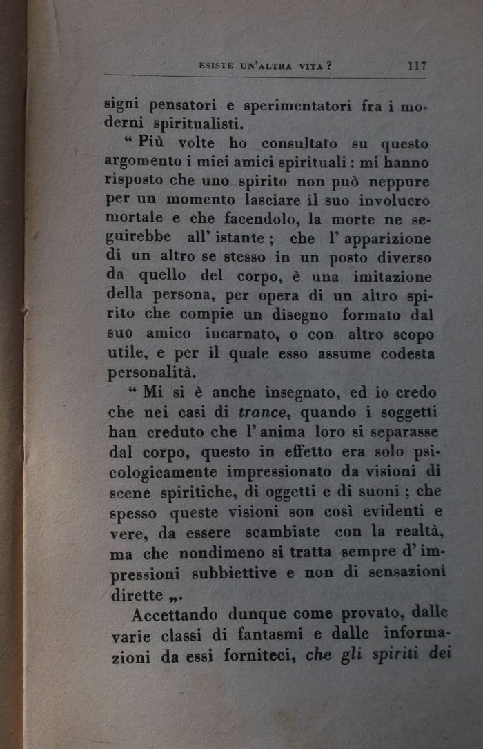 ' Mi si è anche insegnato, ed io credo che nei casi di trance, quando i soggetti han creduto che l'anima loro si separasse dal corpo, questo in effetto era solo psicologicamente impressionato da visioni di scene spiritiche, di oggetti e di suoni ; che spesso queste visioni son così evidenti e vere, da essere scambiate con la realtà, ma che nondimeno si tratta sempre d'impressioni subbiettive e non di sensazioni dirette „.