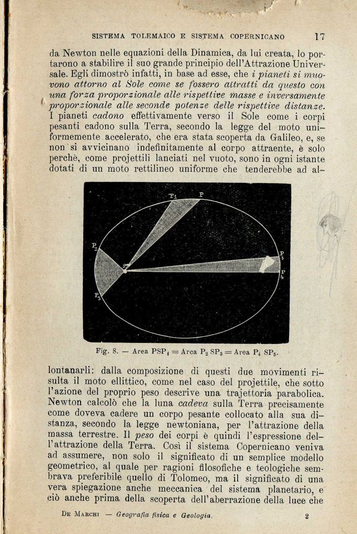 da Newton nelle equazioni della Dinamica, da lui creata, lo portarono a stabilire il suo grande principio dell'Attrazione Universale. Egli dimostrò infatti, in base ad esse, che i pianeti si muovono attorno al Sole come se fossero attratti da questo con una forza proporzionale alle rispettive masse e inversamente proporzionale alle seconde potenze delle rispettive distanze. I pianeti cadono effettivamente verso il Sole come i corpi pesanti cadono sulla Terra, secondo la legge del moto uniformemente accelerato, che era stata scoperta da Galileo, e, se non si avvicinano indefinitamente al corpo attraente, è solo perchè, come proiettili lanciati nel vuoto, sono in ogni istante dotati di un moto rettilineo uniforme che tenderebbe ad al-